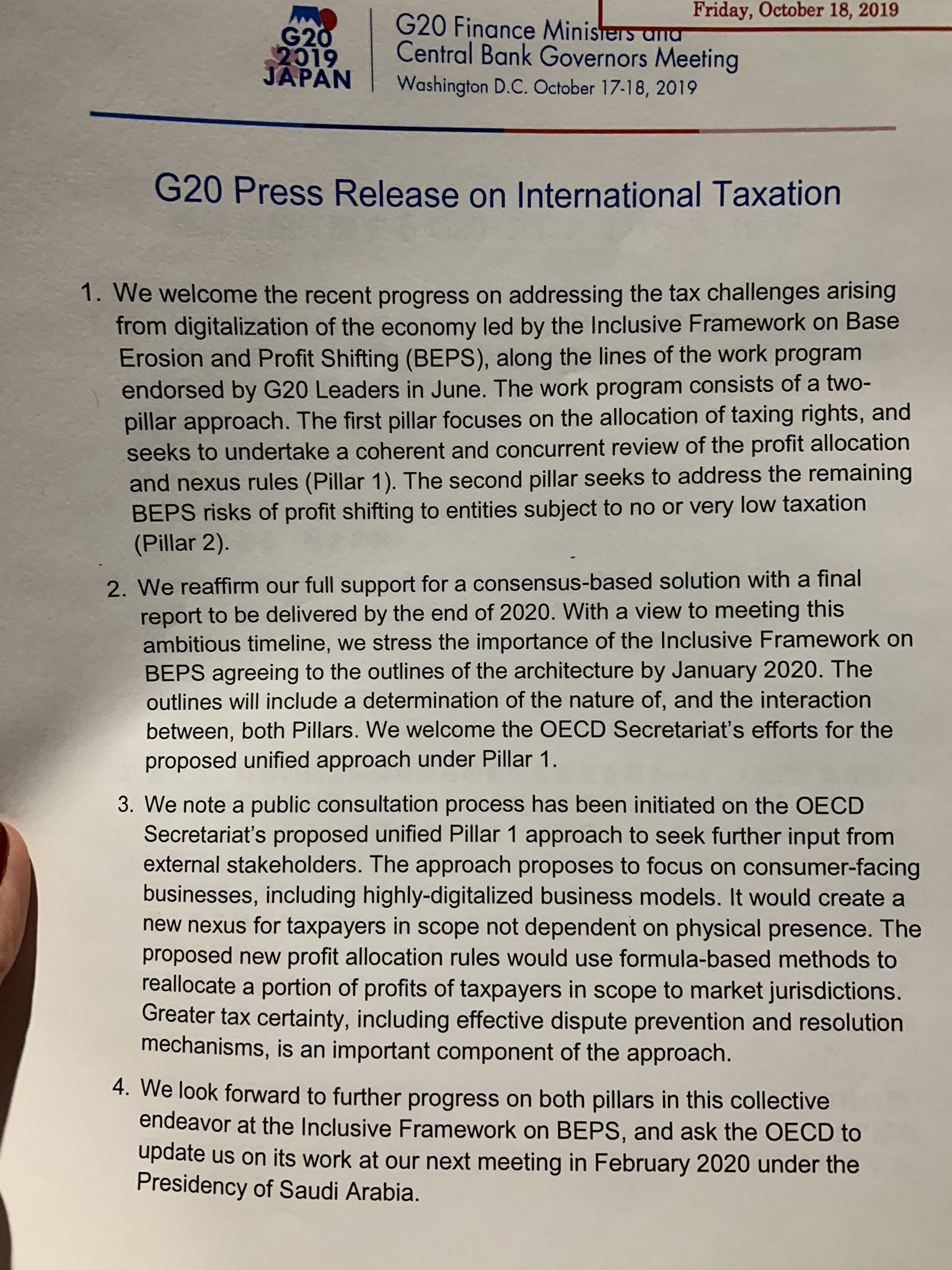 Stephanie Johnston On Twitter G20 Finance Ministers Statement We Stress The Importance Of The If On Beps Agreeing To The Outlines Of The Architecture By Jan 2020 On Pillars 1 2 Oecdtax Proposed